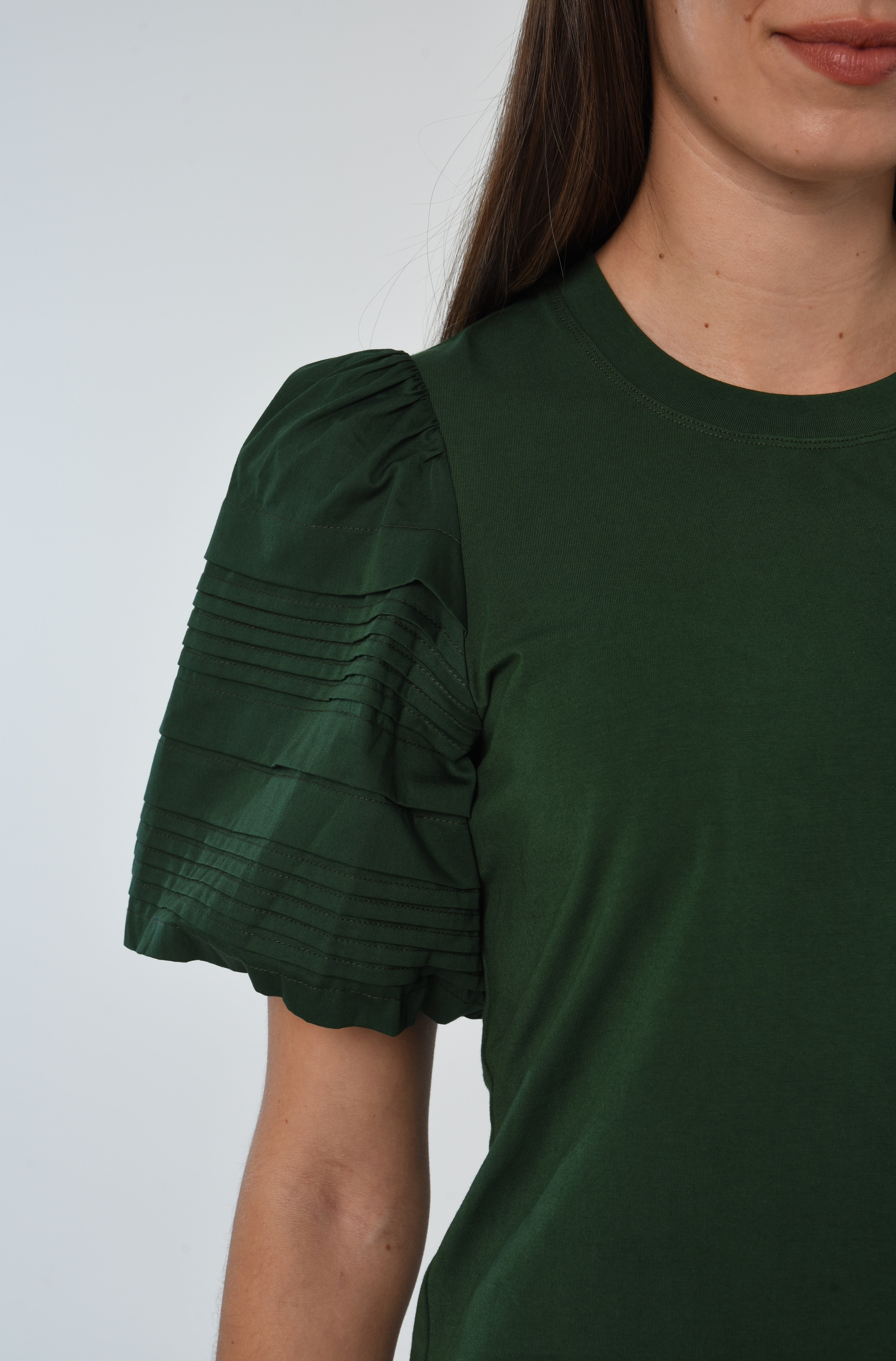 Designed with wide pintuck pleats at the puff sleeves. The Dylan Tee is offered this season in a deep green.