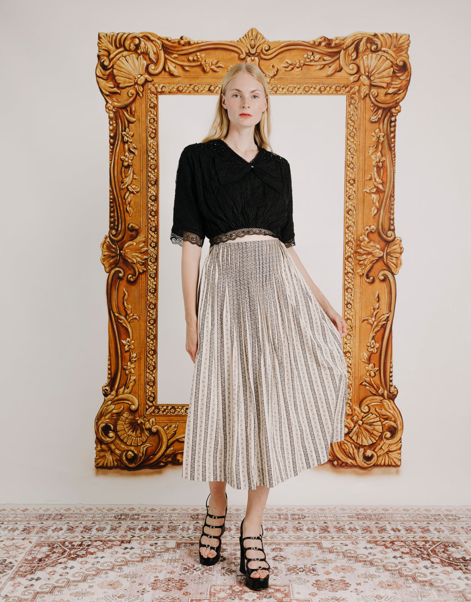 placed on the pleats. And the back of the skirt is encased with a soft elastic, that creates gathering throughout the body.