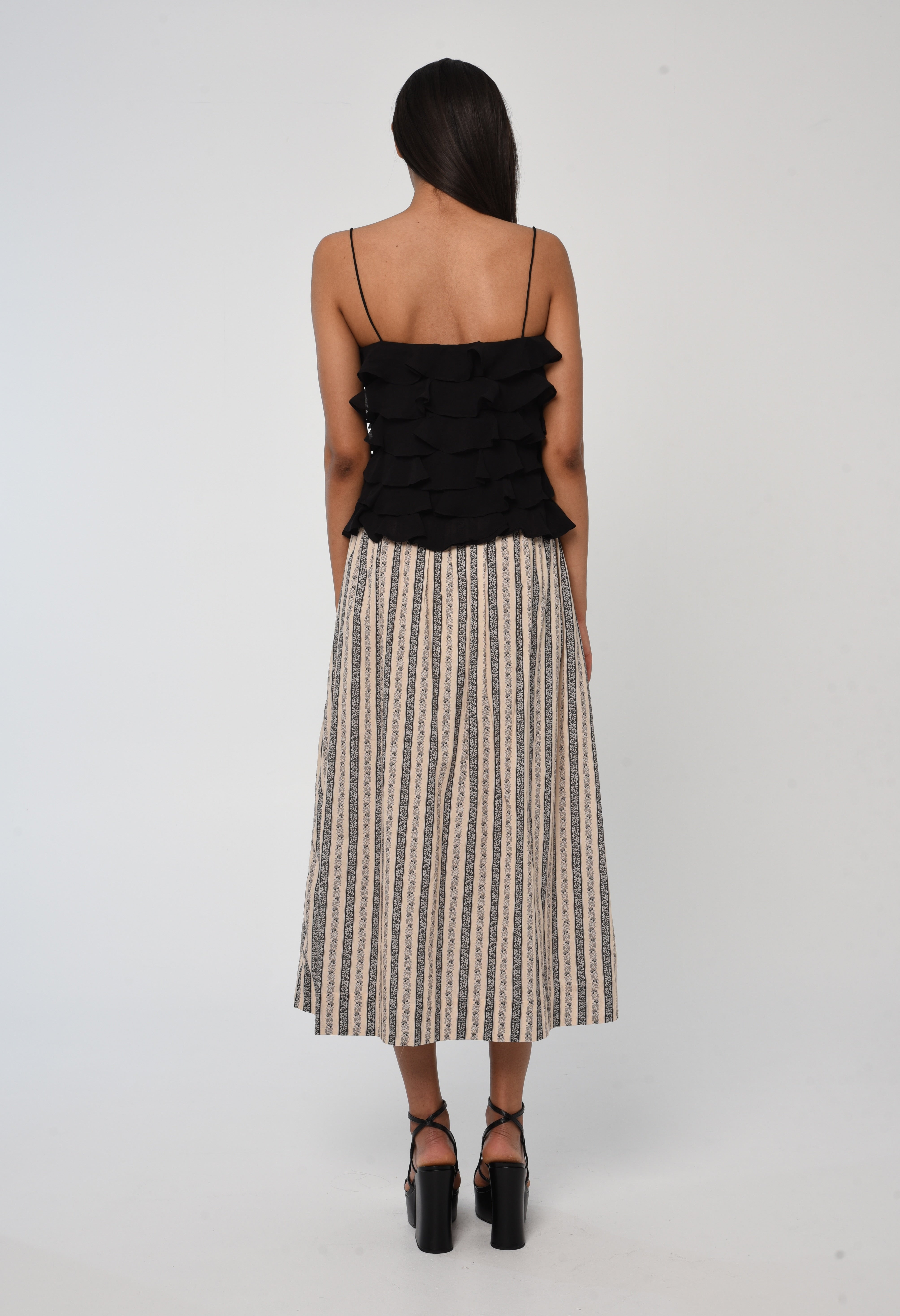 The Karina Skirt in the Clara Stripe Print is an easy pull on skirt. The front of the skirt is fully pleated, with the stripe print