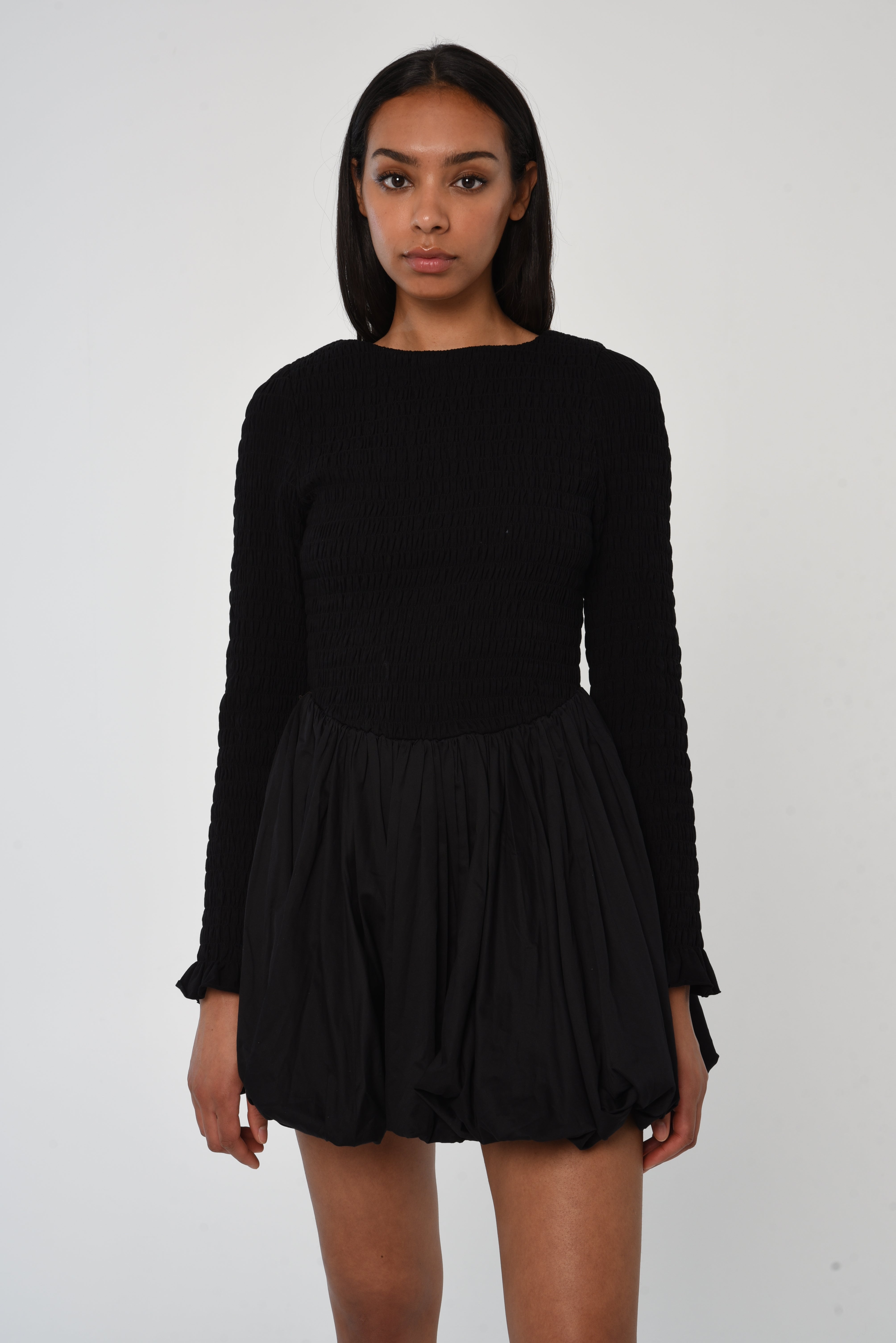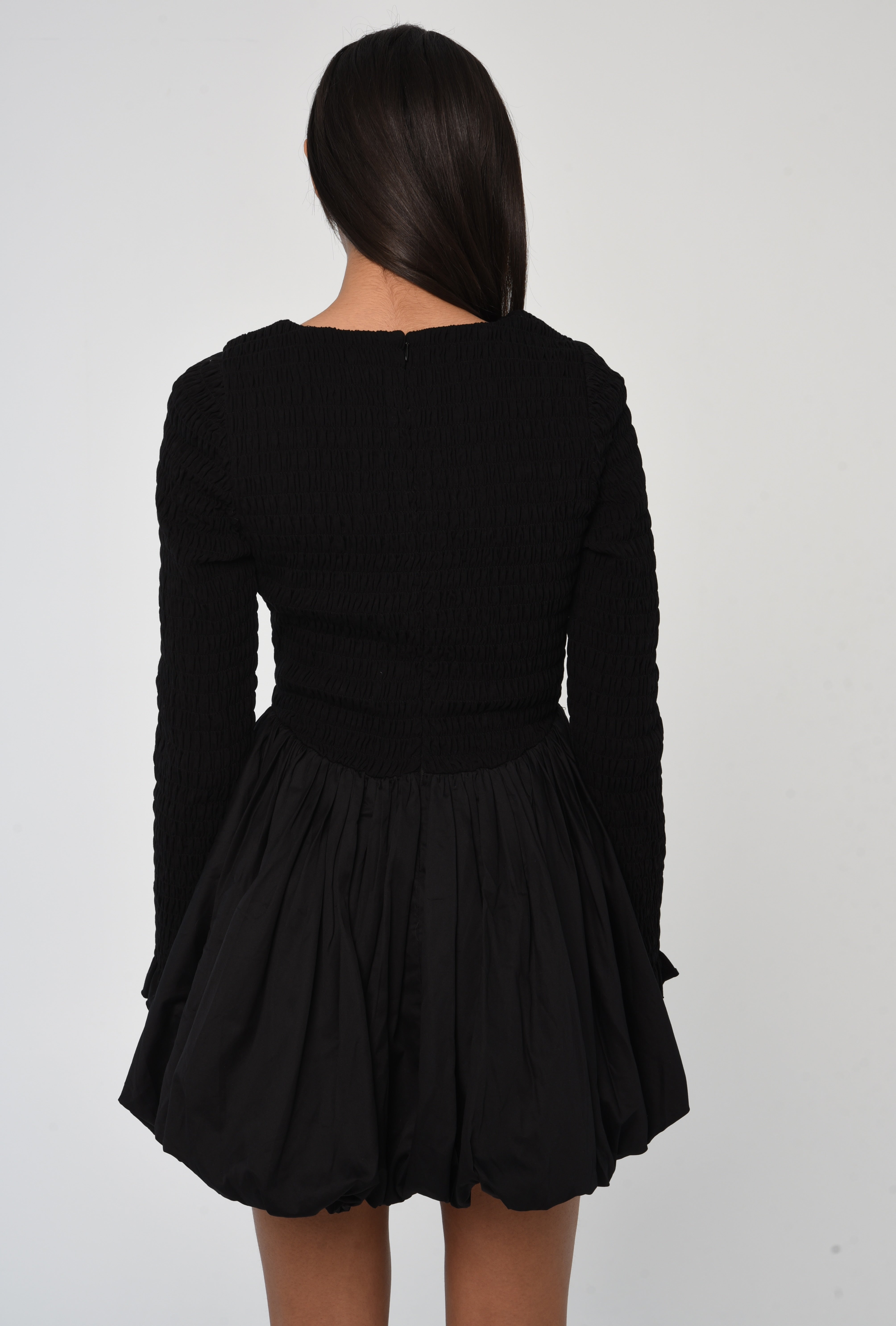 The Rebecca Dress in Black is effortlessly chic with its smocked bodice and sleeves with a voluminous bubble hem skirt, creating a playful yet elegant silhouette. Perfect for date nights, parties, or holiday gatherings