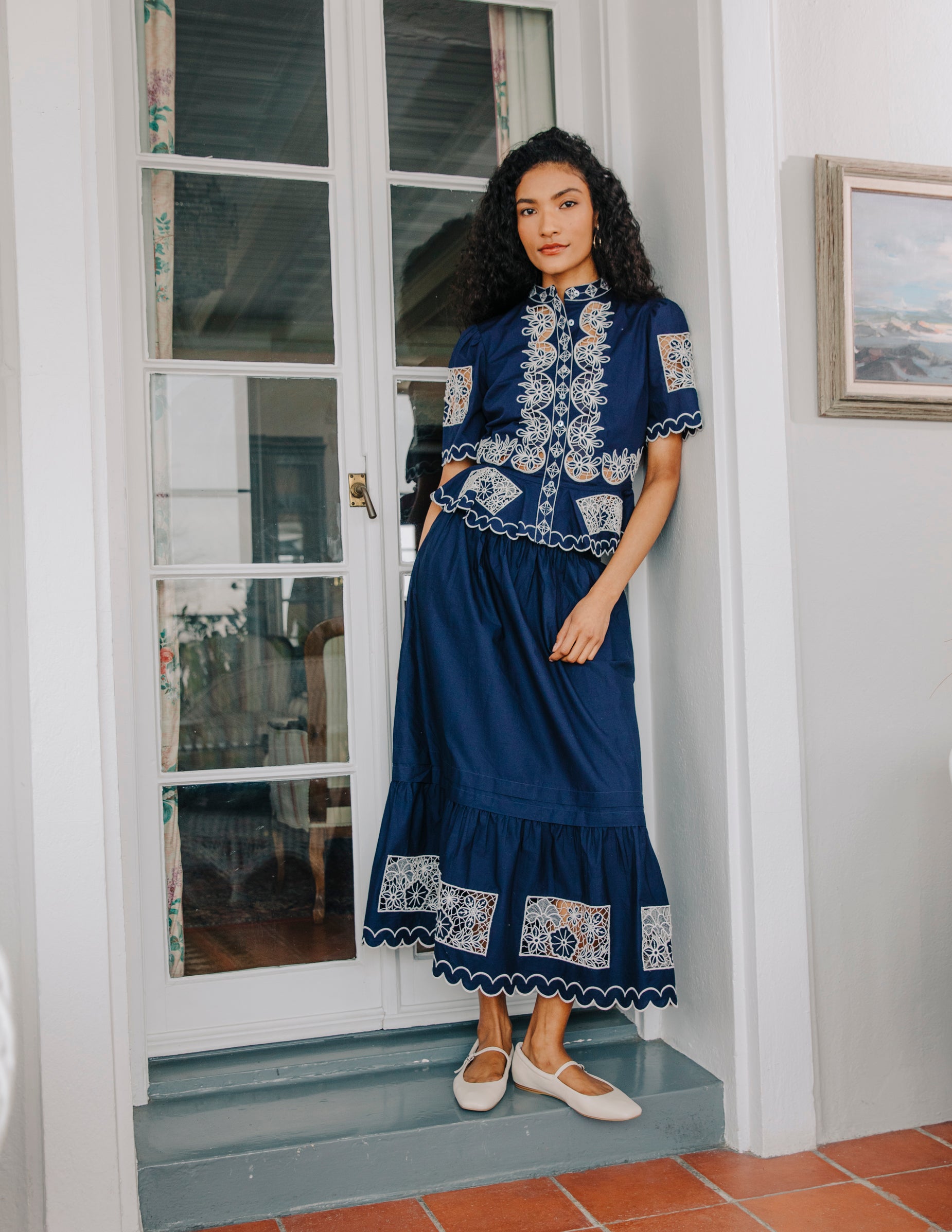 The Elizabeth Top is offered this season in our classic Cotton Poplin in Navy.
