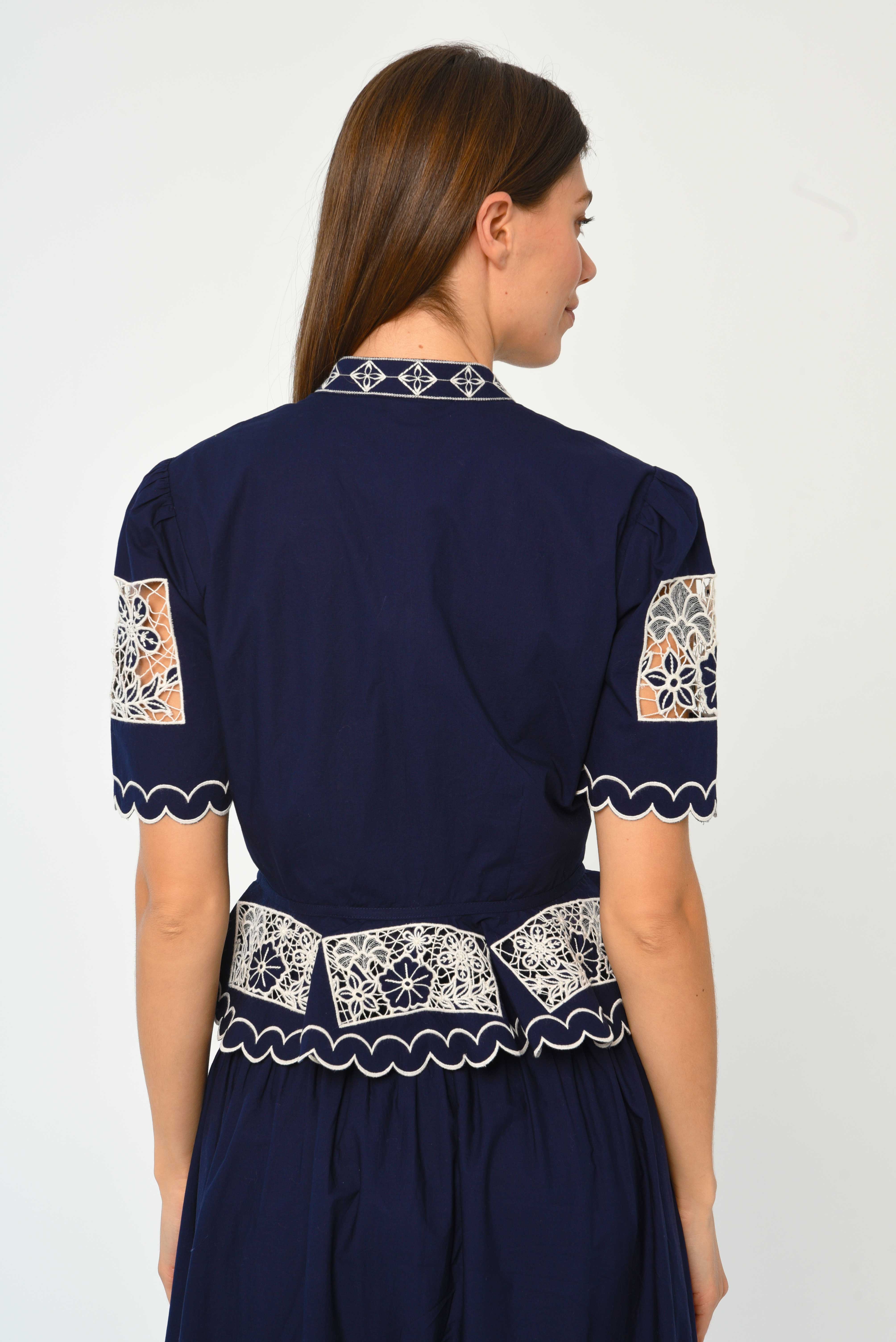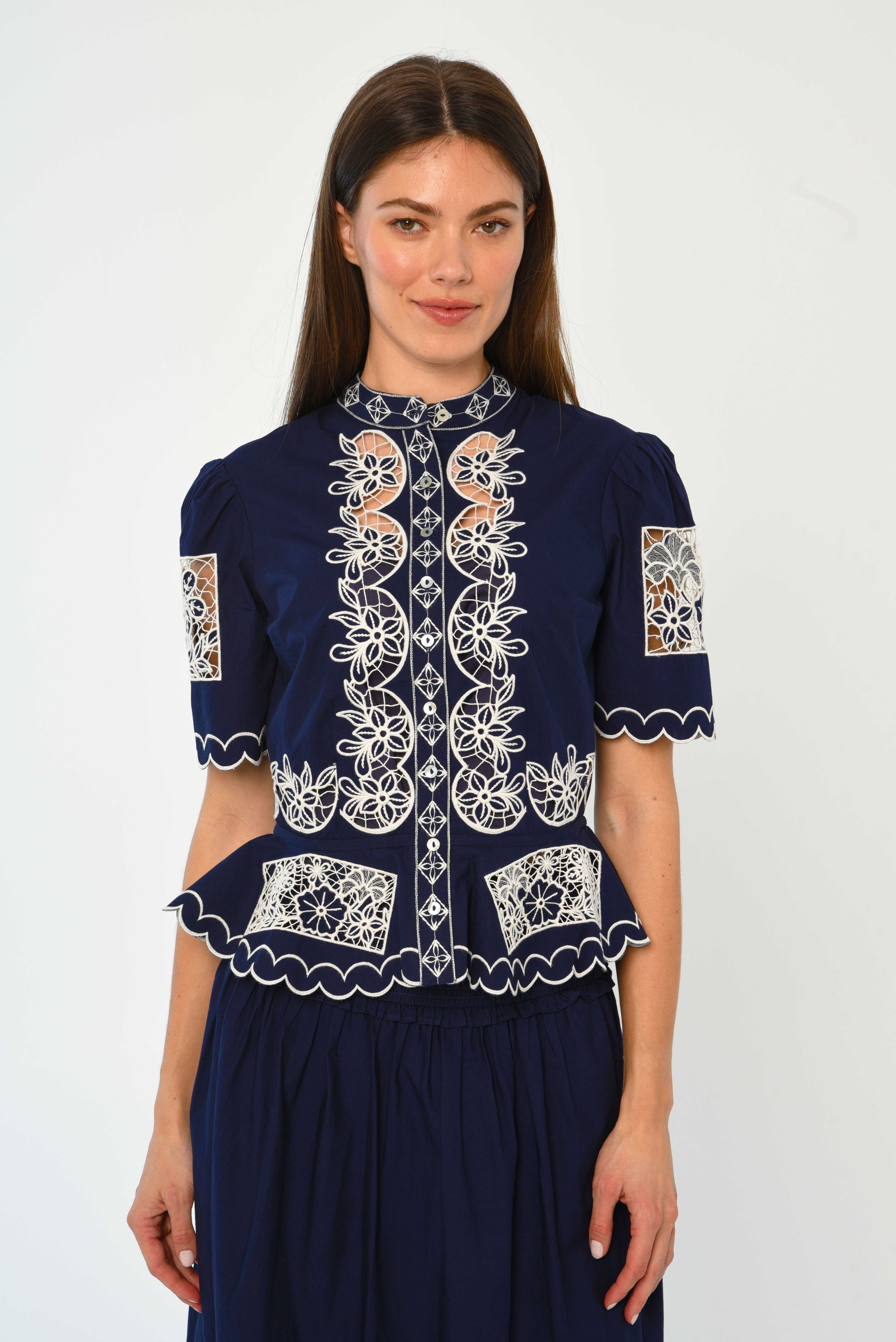 Its feminine silhouette is defined by short sleeves, a scalloped peplum hem, and a refined button down front with a high neck collar.