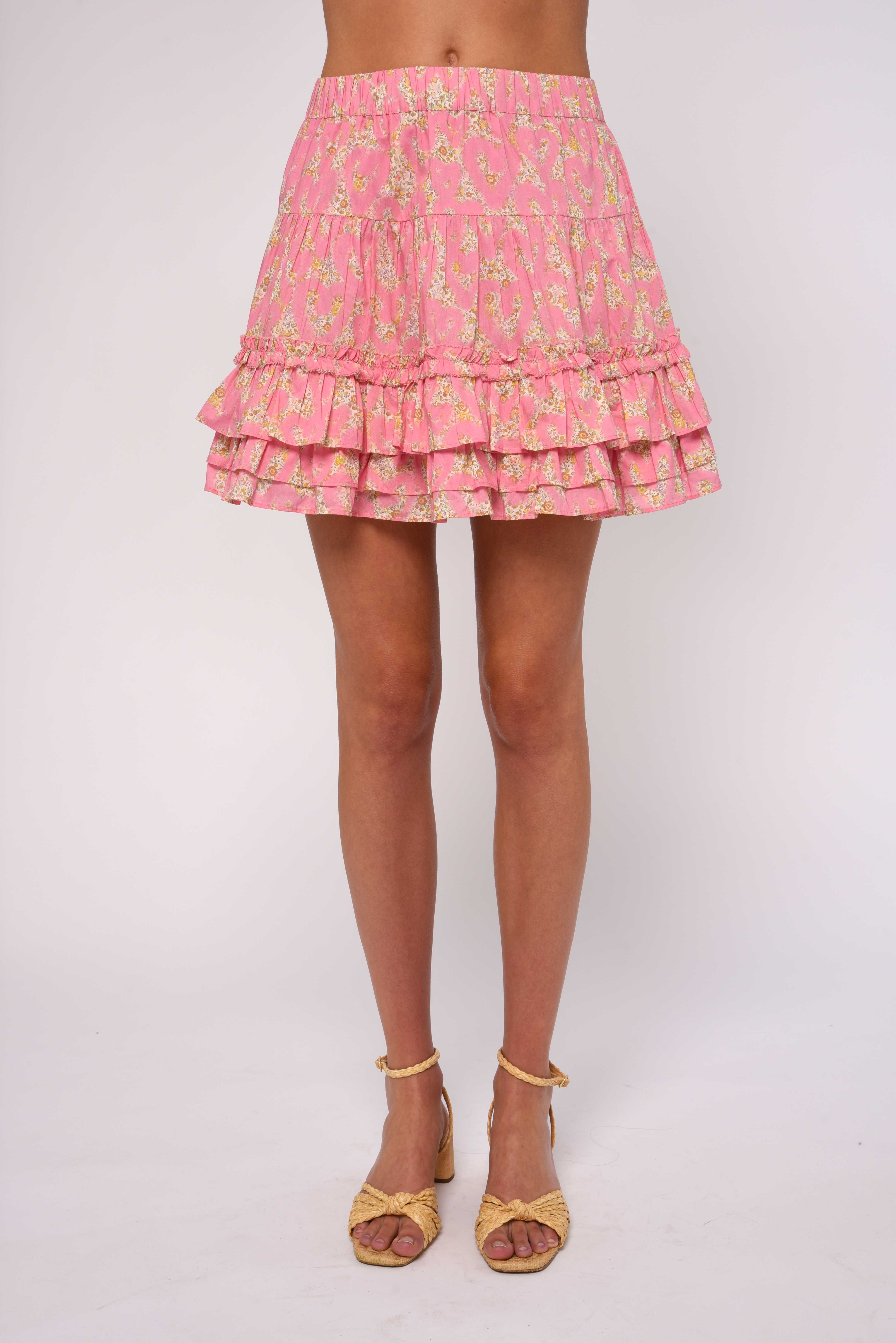The Emma Mini Skirt is a flirty, spring ready essential. Featuring two ruffled layers at the hem and a mini ruffle at the seam,