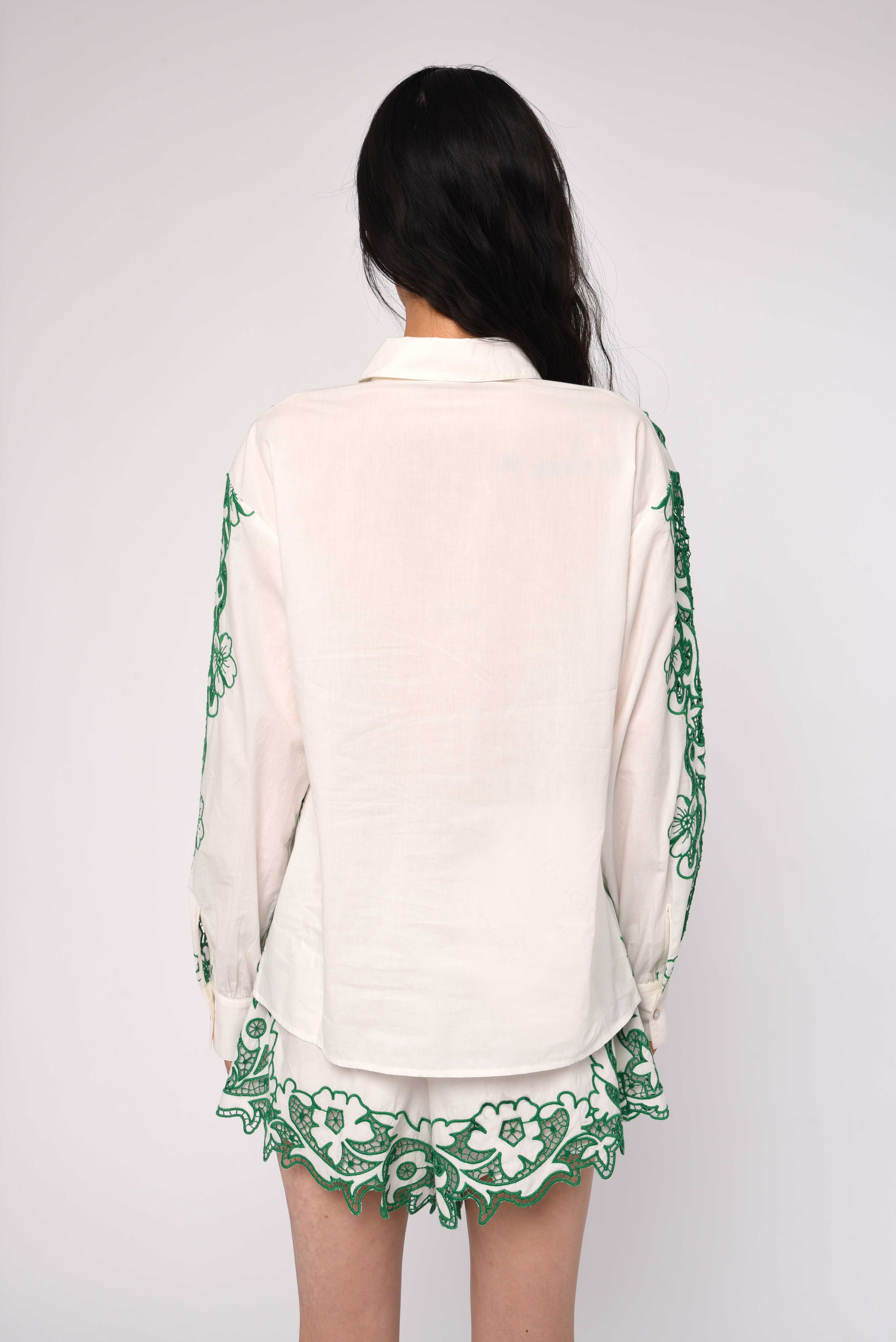 Meet the Trinity Top, our modern take on the classic white button-down. Crafted in our classic cotton poplin, this oversized shirt features green laser-cut embroidery throughout. Pair it with the Trinity Short for a complete matching set moment.