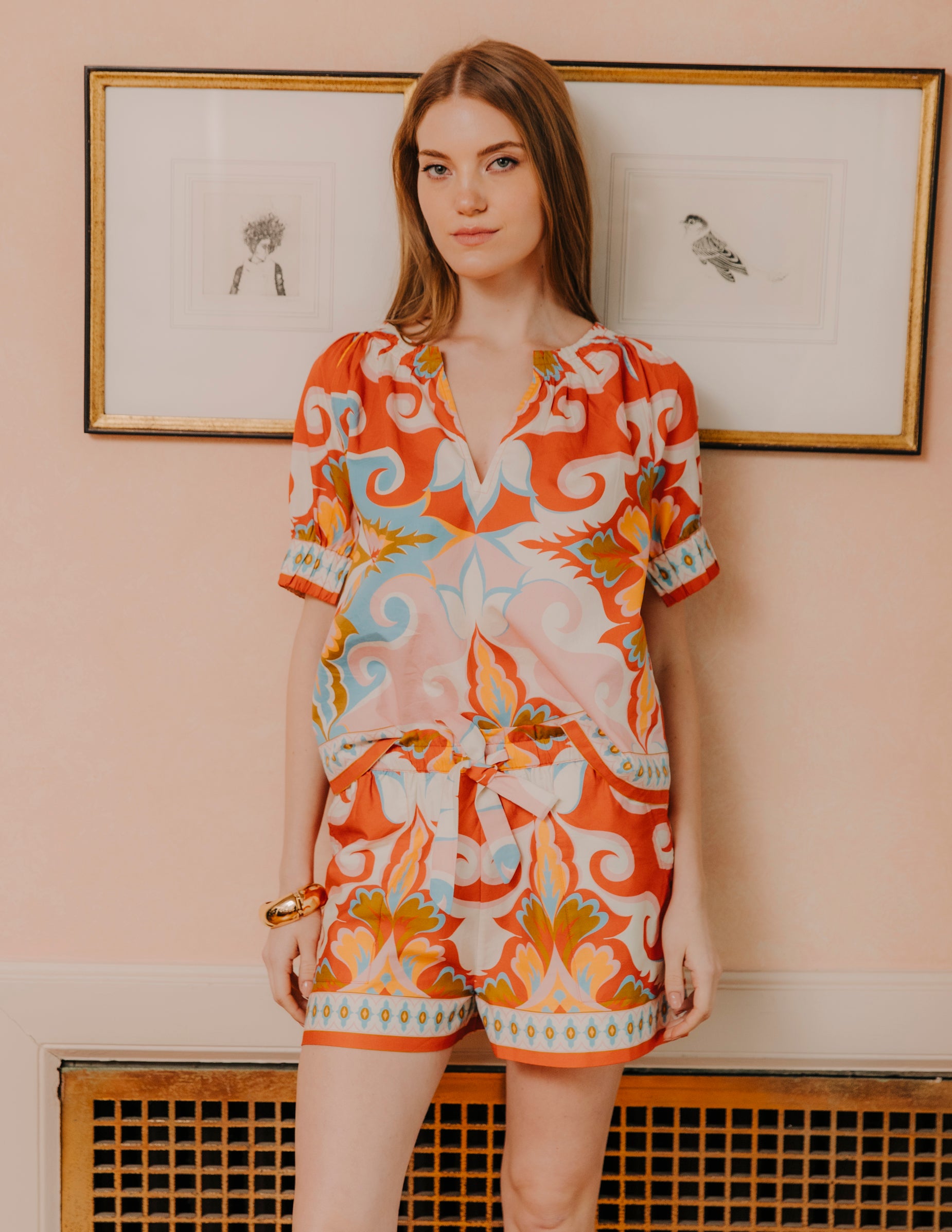 Designed with a slit neckline and encased elastic at the sleeve openings, it is sure to make a statement with its bold print.