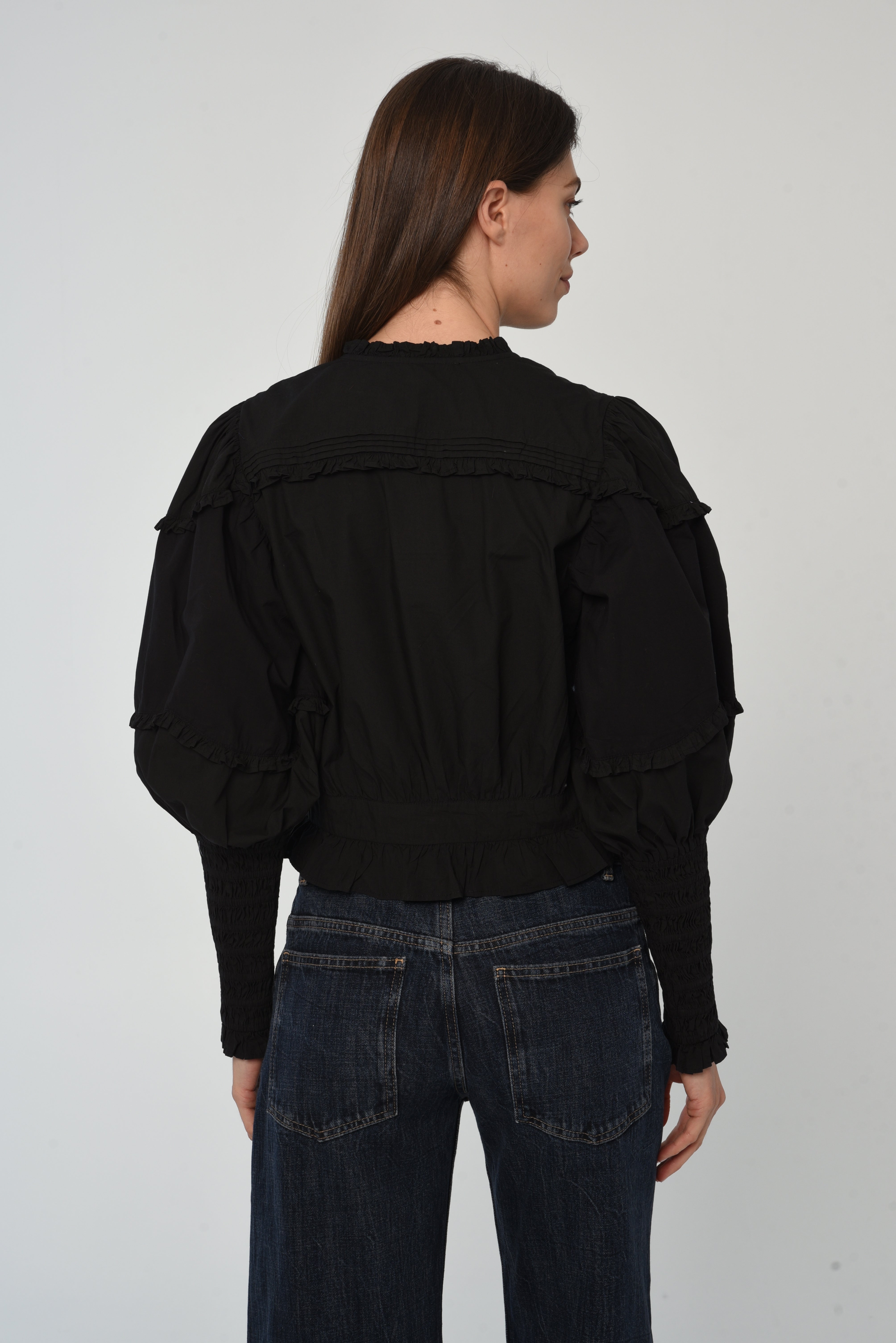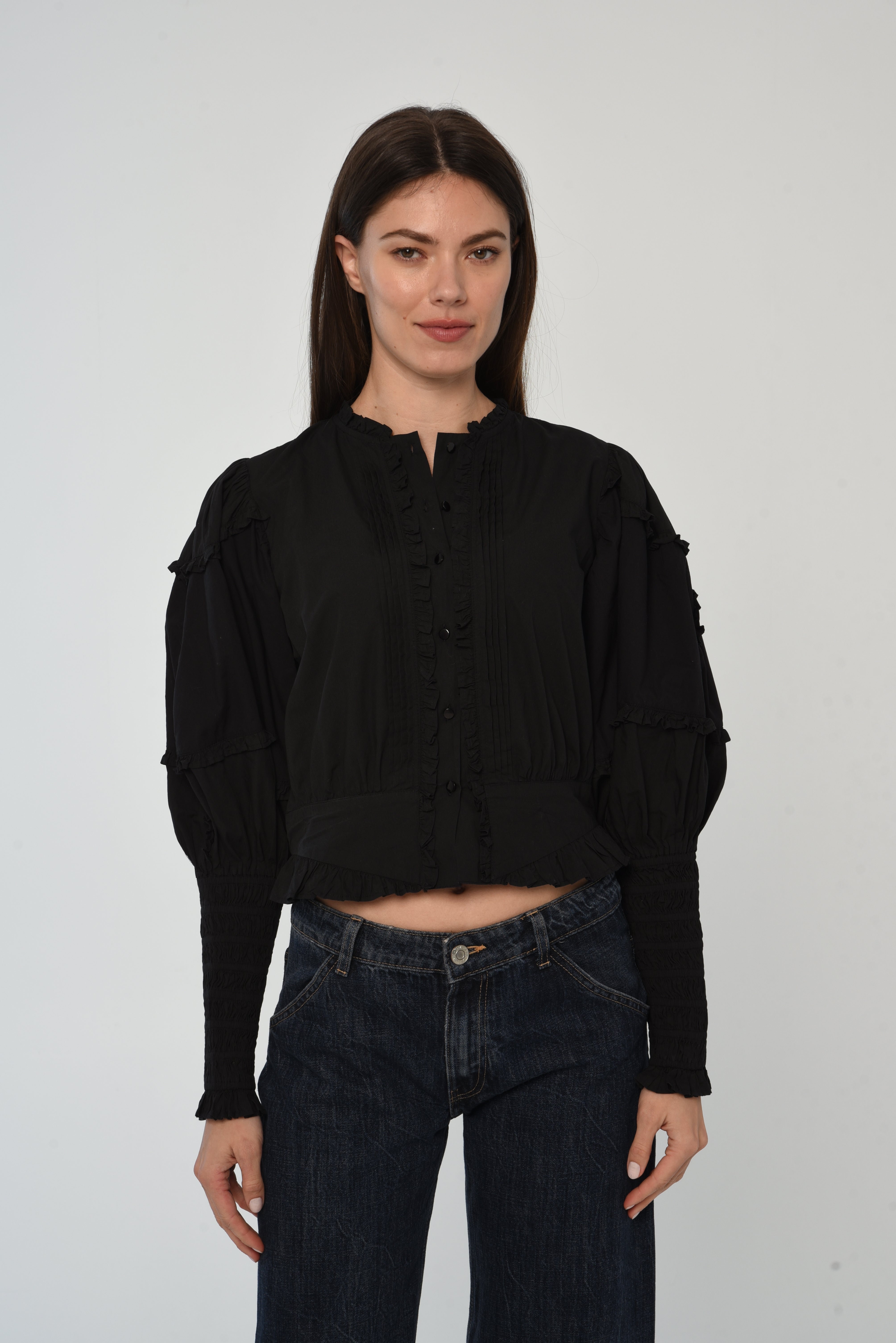 Welcome the vintage-inspired Marius Top in our classic Cotton Poplin. Offered in both black and white, this piece easily becomes a wardrobe staple. It showcases mini ruffled details on the puff sleeves, along the center front, and at the hem, paired with a flattering, exaggerated smocked cuff and a yoke detail finished with a ruffle. Fully button-up, she’s beautiful for any season.