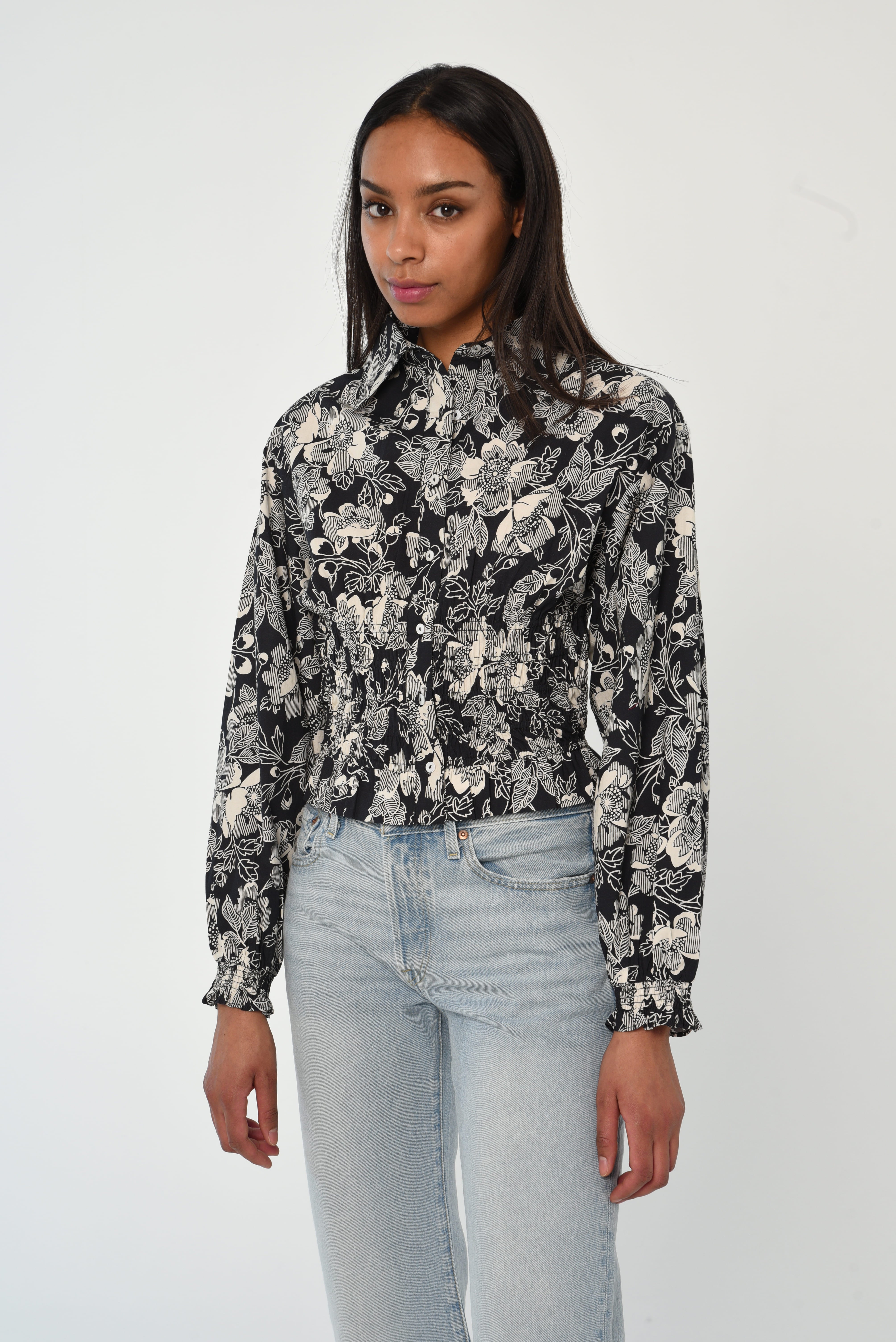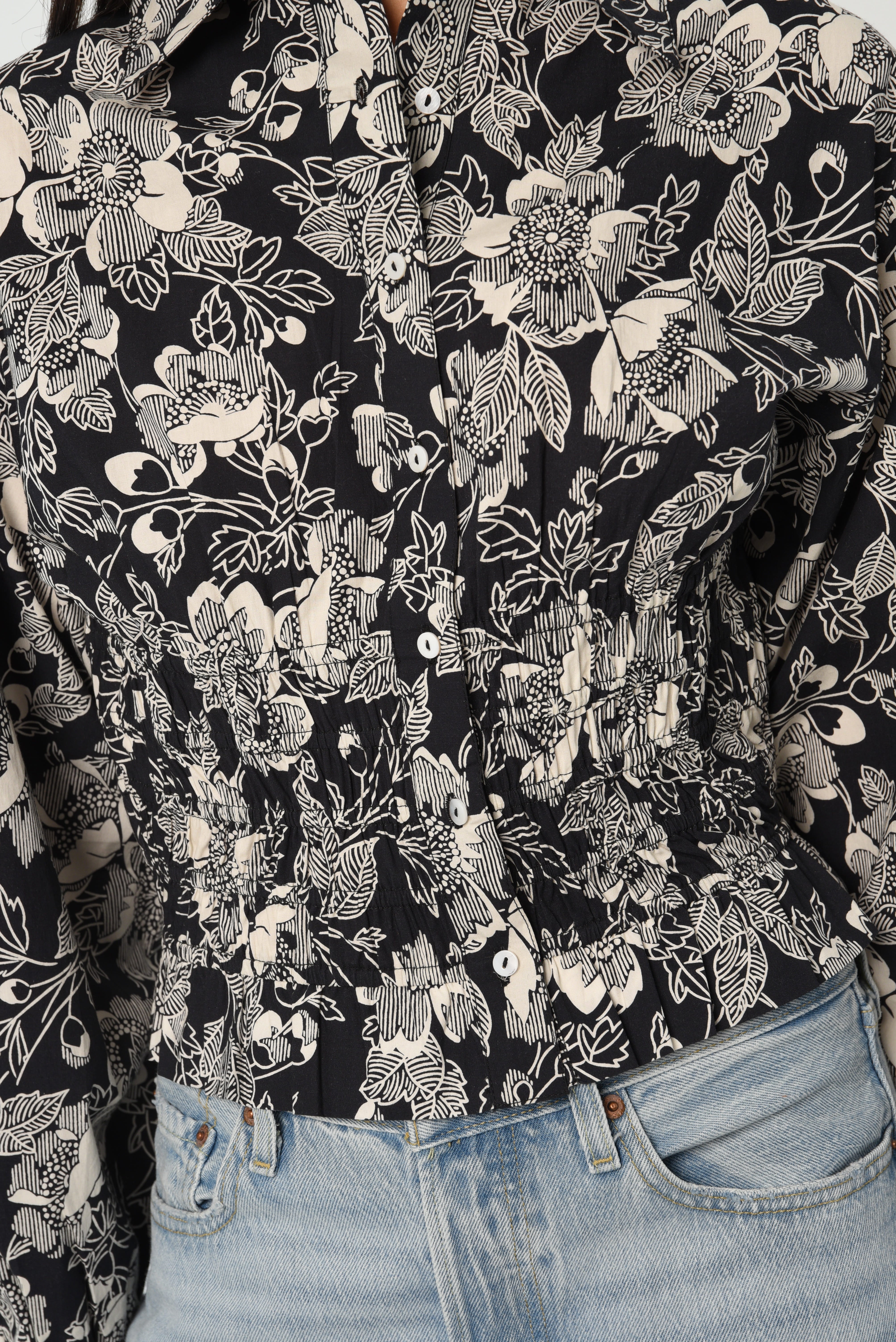 Love the Label’s take on a classic button-down: meet the Rolo Top in our Cotton Poplin fabric, in the Moonlit Floral Print. It features a collared neckline and a button-down placket with delicate shell buttons at the center front. The waist is cinched with soft smocking and finished with a ruffled hem. Your go-to flattering button-down, pair it with the Wanda Skirt for a head-to-toe printed moment or with jeans for a more casual look.