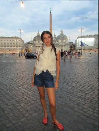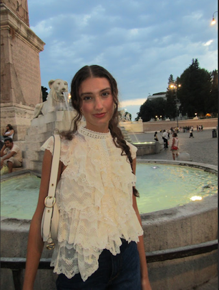Shanelle brings the Eden Top to the Fontana dei Leoni in Piazza del Popolo, one of Rome’s most iconic squares where grand architecture and lively atmosphere meet — the lace details of the top perfectly complement the romance of the city.