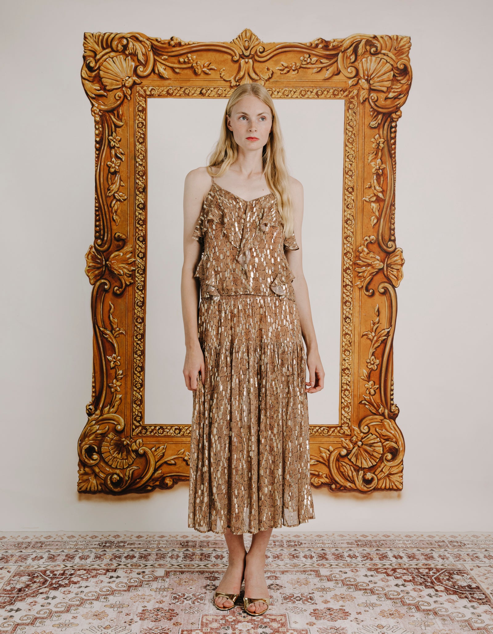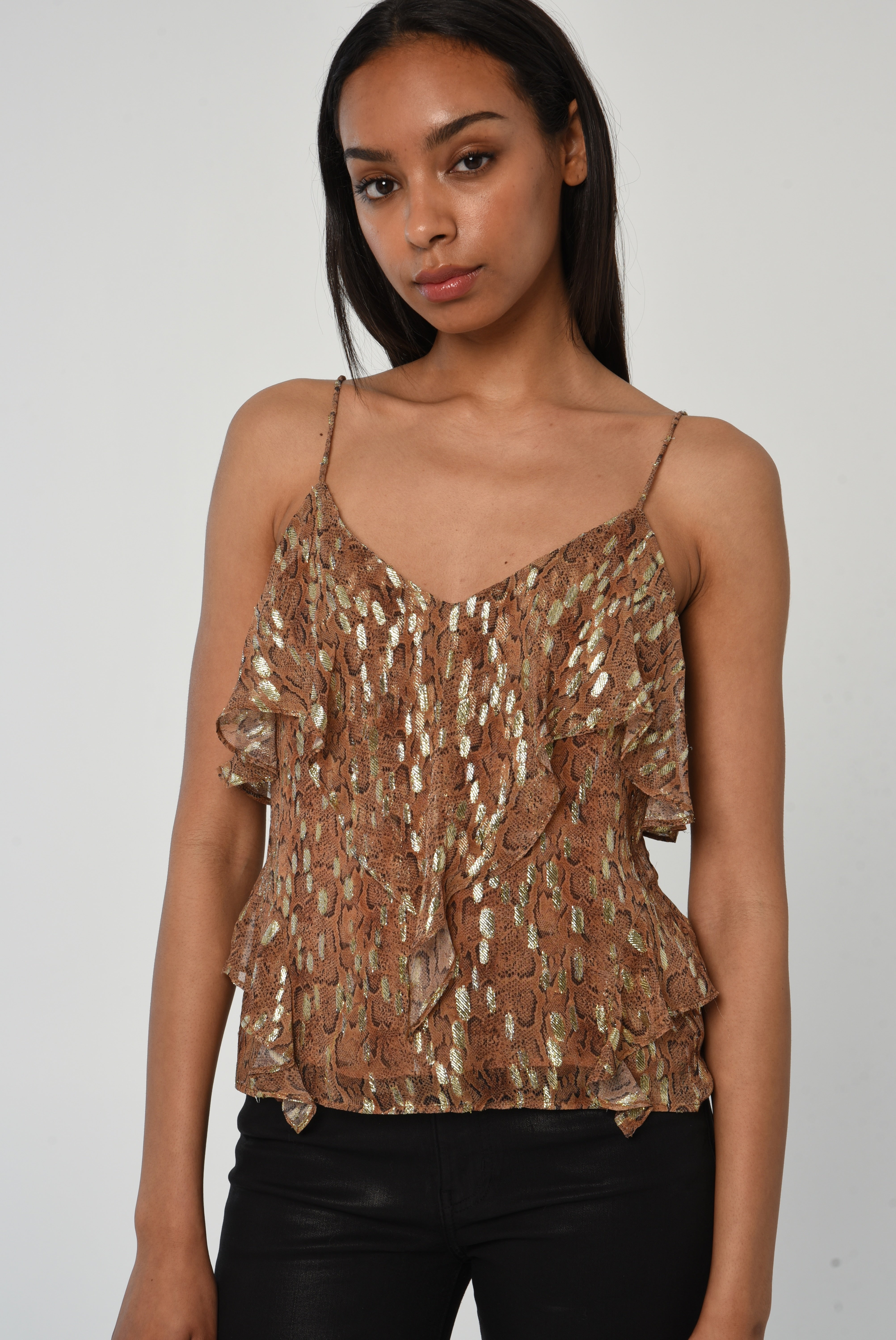 • The Lilly Cami in the Cavalier Python Print, is our favorite party top for this season! The print has accents of gold lurex throughout it