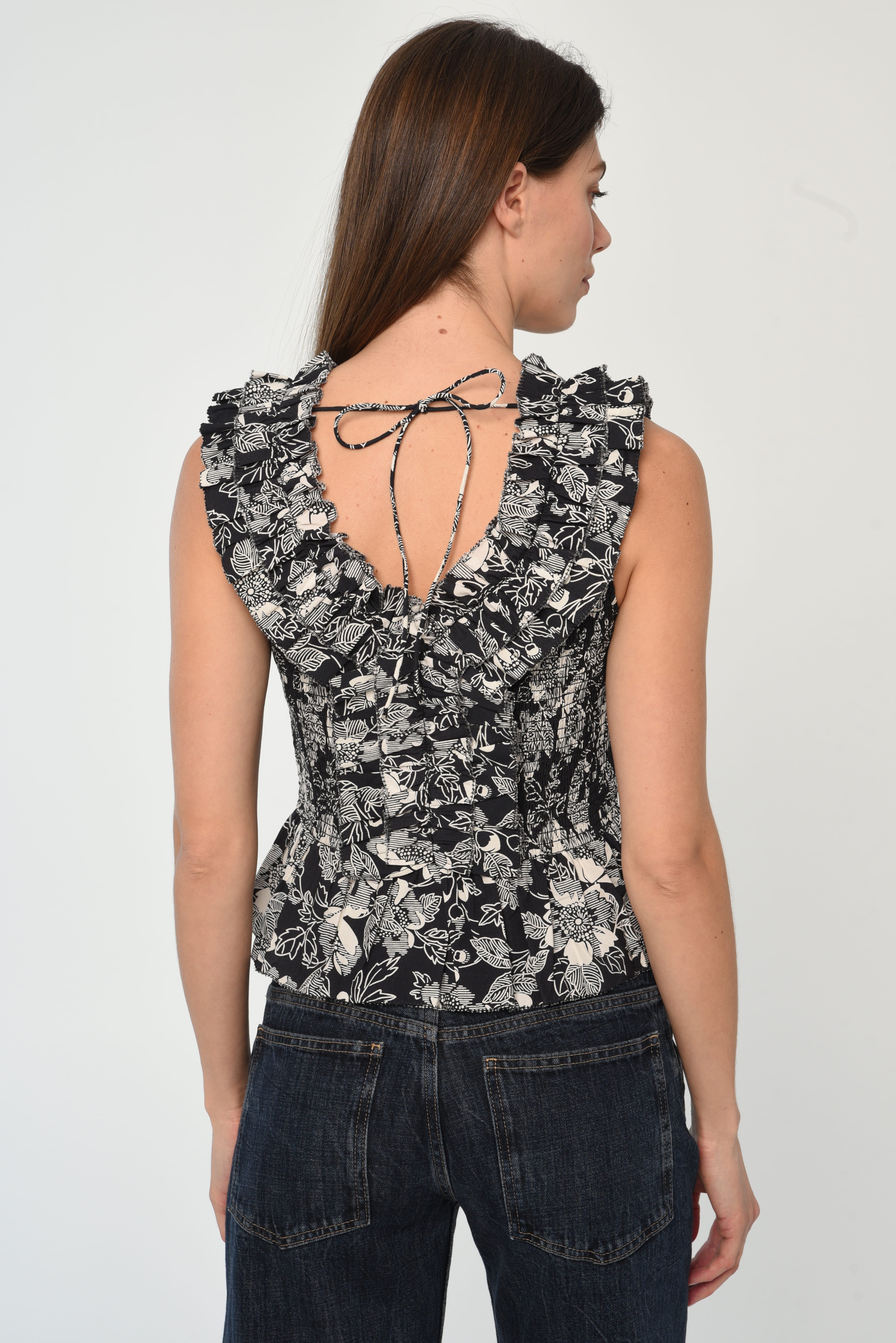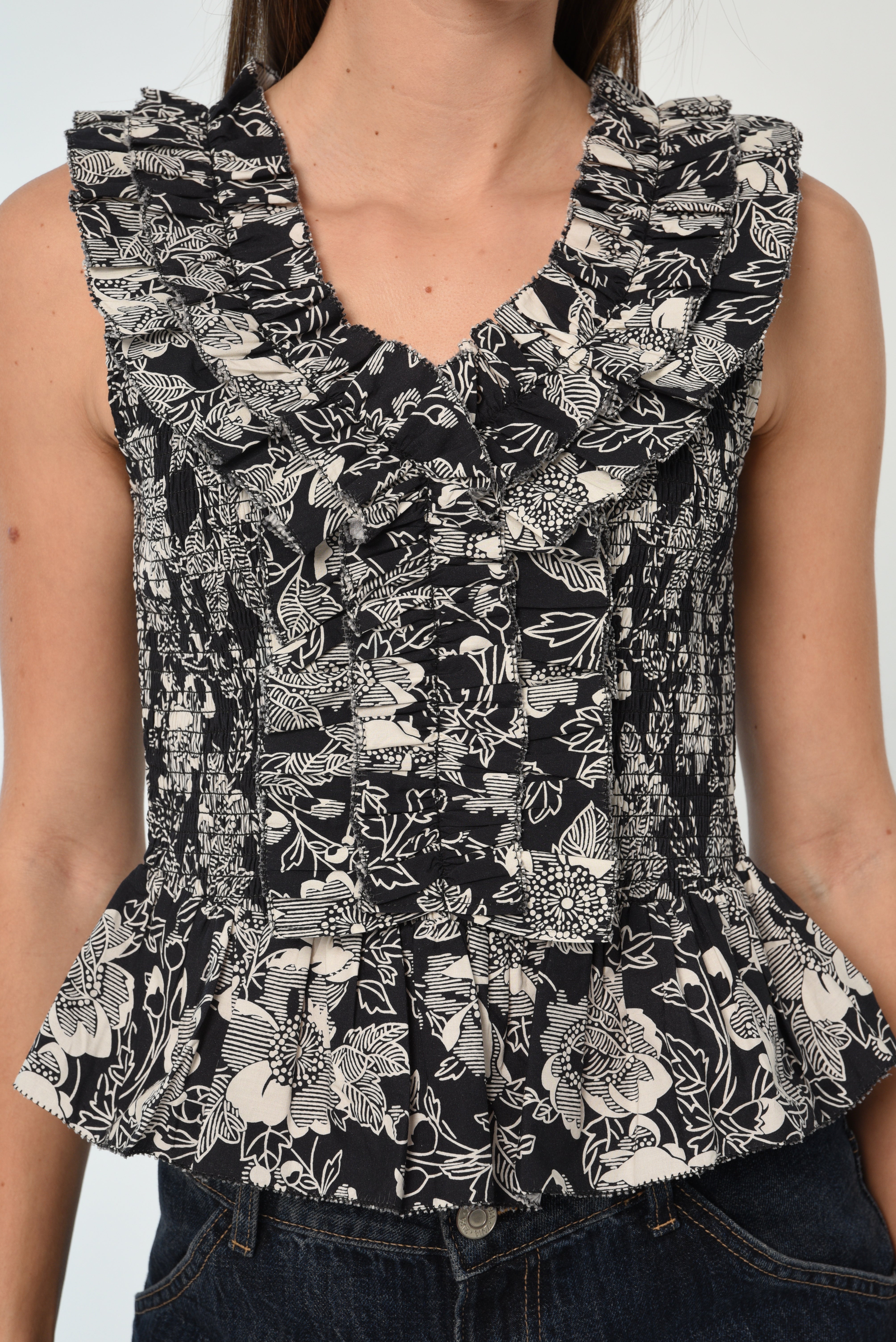 Welcome back Love the Label’s core top, the Zephyr. It features two layers of ruffles at the front and back neckline finished with a picot edge, as well as a ruffled peplum waist hem. The entire bodice is fully smocked for an easy slip-on fit and ties at the back neck for added security. Pair it with the Wanda Skirt for a head-to-toe printed moment.